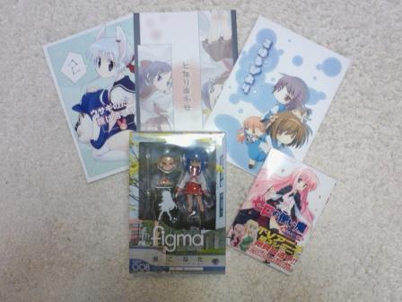 左から同人誌、らき☆すたの同人、ハルヒの同人、ゼロ使の公式アンソロ、そしてfigmaこなたです。